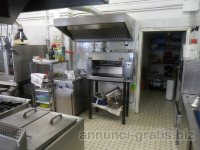 attrezzatture: cella frigorifera, frigor, frizer,friggitrice a 2 vasche, cuocipasta, forno aconvenzione, piastra grande, cucina gas 4elementi,vari banchi in acciaio, affettatrice, due vasche lavandino, munita di dispensa e magazzino.CUCINA A