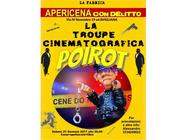 Sabato 21 Gennaio 2017, ad Avigliana, in Via IV Novembre 19, alle ore 20-00, Apericena con delitto a La Fabrica. Una intera notte dedicata al fascino del mistero in compagnia dell'Ispettore Poirot. Il più noto investigatore belga della Storia arriva in un prestigioso Hotel nella città dei Laghi ed incontra per caso una famosa troupe cinematografica. Il suo intento è quello di riposarsi e rilassarsi, invece, si troverà presto coinvolto in un caso di omicidio. Due colpi di pistola segneranno la fine di una preziosa vita. A tutti i presenti toccherà il compito di partecipare alle indagini e di sfidarsi per scoprire chi possiede più "celluline grigie". I migliori tra gli intervenuti riceveranno in premio il diploma di investigatore (della serata). Per tutti, al termine dell'Evento, un grazioso libro edito in omaggio.