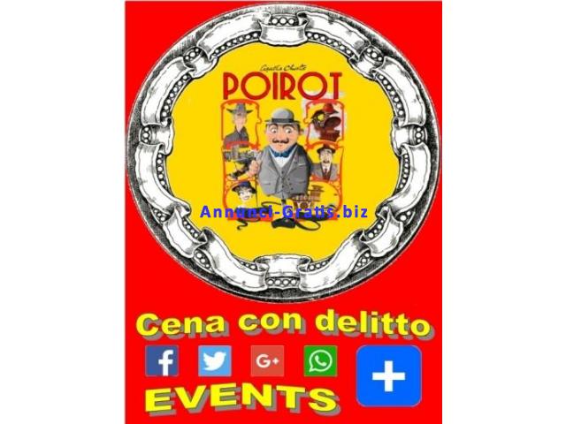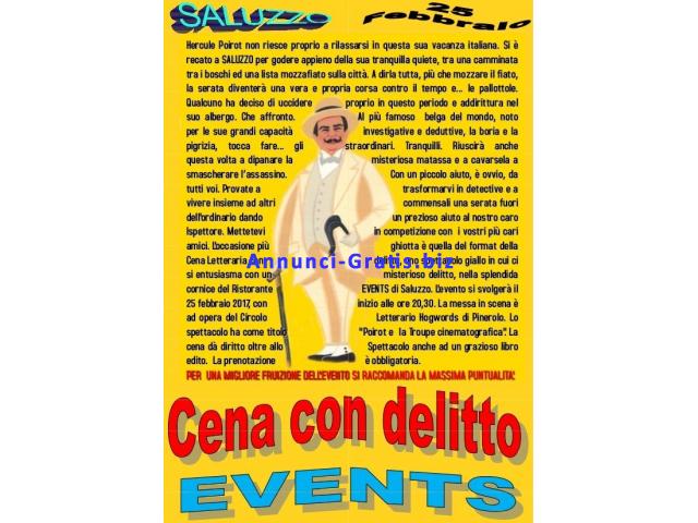 Events è un Ristorante unico nel suo genere ed è adatto in modo particolare per gestire serate a tema, celebrazioni, matrimoni, convention per formazione aziendale. Ambiente boho chic, aperto 365 giorni l’anno, dotato di un giardino esterno per il periodo estivo, capacità di ospitare 400 coperti, ampia scelta di catering convenzionati, fotografi, video-maker, musicisti, wedding planner. La Cena/Evento si svolgerà il sabato 25 febbraio 2017, con inizio alle ore 20,30. Per una migliore fruizione dello spettacolo si raccomanda la massima puntualità. La messa in scena è ad opera del Circolo Letterario Hogwords di Pinerolo. Lo spettacolo ha come titolo "Poirot e la Troupe cinematografica". Un investigatore belga cerca di riposarsi in Italia nella quiete della provincia cuneese ma un omicidio nell’albergo che lo ospita attira la sua attenzione e lo costringe, controvoglia, ad interrompere i suoi agi. Quattro sospetti, due uomini e due donne, stimoleranno la sua materia grigia fino all’epilogo finale. I migliori 3 investigatori tra gli intervenuti riceveranno un grazioso attestato. La cena dà diritto oltre allo Spettacolo anche ad un gradevole libro edito. La prenotazione è obbligatoria.