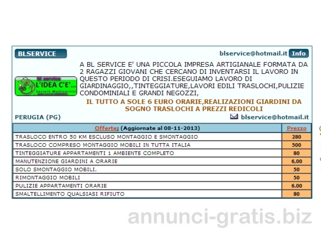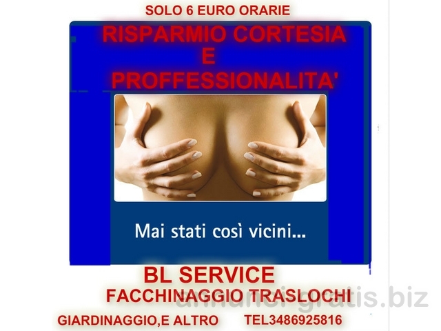 PERDONACI IL DISTURBO LA BL SERVICE E' UNA PICCOLA IMPRESA ARTIGIANALE FORMATA DA 2 RAGAZZI GIOVANI CHE CERCANO DI INVENTARSI IL LAVORO IN QUESTO PERIODO DI CRISI.ESEGUIAMO LAVORO DI GIARDINAGGIO,,TINTEGGIATURE,LAVORI EDILI TRASLOCHI,PULIZIE CONDOMINIALI E GRANDI NEGOZZI,IL TUTTO A SOLE EURO 6 ORARIE FATTURABBILI