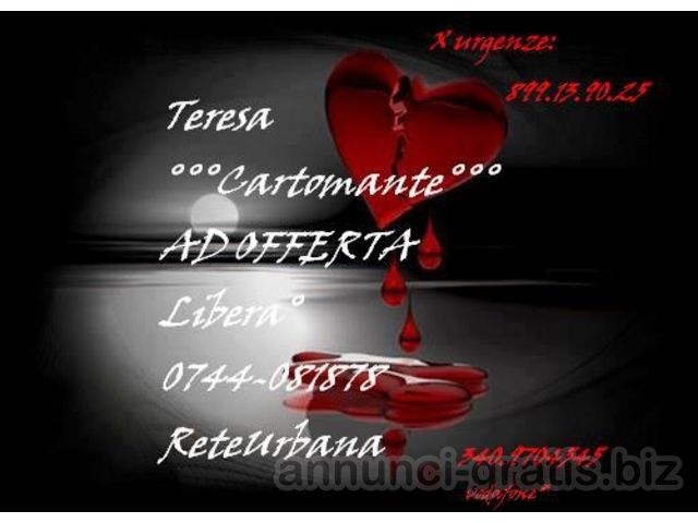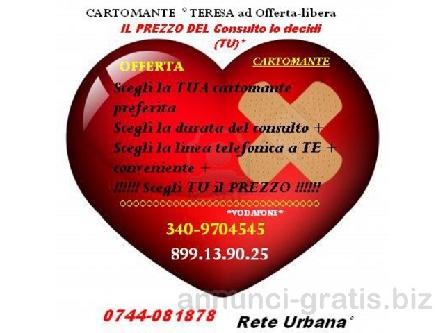 Maddalena esperta cartomante e sensitiva (esperienza ventennale) risponde a tutte le tue domande con attendibilità e professionalità su appuntamento ad offerta libera (tramite ricarica su carta Poste Pay o Paypal) e senza limiti di tempo su diverse linee telefoniche a tua scelta (fisso, tim, wind, vodafone e postemobile). E' possibile effettuare anche video consulti su MSN. per info. chiama 0744/081878 (fisso) o 340/9704545 (vodafone). Solo per urgenze 899.13.90.25. costo euro 1,50 al min. Visita il nostro sito www.cartomante-sensitiva.it