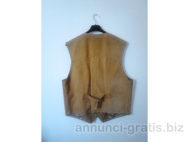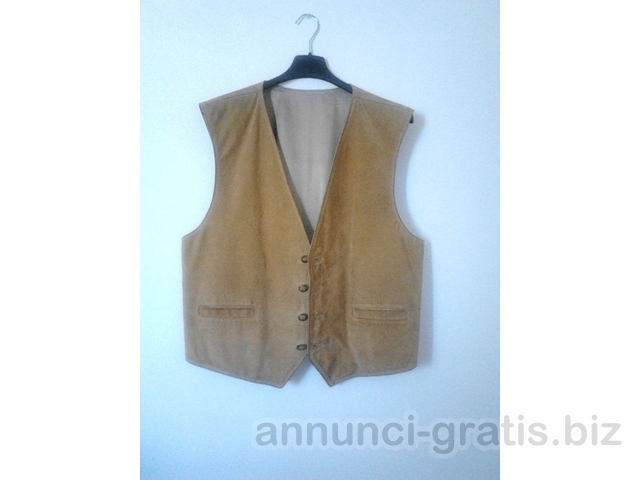 Bellissimo gilet da uomo scamosciato colore beige. Due tasche anteriori, quattro bottoni anteriori più un bottone di riserva interno. Cinturino regolabile con fibbia sul retro. Taglia 48. Usato pochissimo.