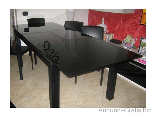 Tavolo in cristallo nero larghezza 90 cm., lunghezza 170 cm. allungato 230 x 90 E' un tavolo allungabile ideale per un soggiorno moderno.Risulta essere un tavolo comodo per chi spesso ha ospiti a cena: in 2 semplici mosse si può montare l'allunga di 60 cm. . Si compone di un piano lungo 230 cm( tutto aperto) in vetro laccato nero che è sorretto da una struttura a 4 gambe rivestite in pelle nera. Il tavolo dispone di un'allunga posta sotto al piano che è lunga 60 cm e permette di allungare il tavolo fino a 230 cm, aumentando in questo modo i posti a sedere da 6 a 10 (min-). 6 sedie nere di pelle nera. Tutto è in ottime condizioni si svende per motivi di spazio.