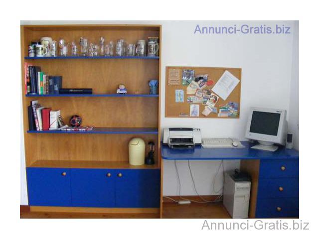 Libreria di quattro ripiani con tre porte alla base, lunghezza di mt 1,50, profondità di mt 0,33 e altezza di mt 2,10. Abbinata a scrivania lunga mt 1,50 e profonda mt 0,75, con tre cassetti sul lato destro. Entrambe in tinta legno e blu. Ottimo stato, in vendita per cambio residenza.