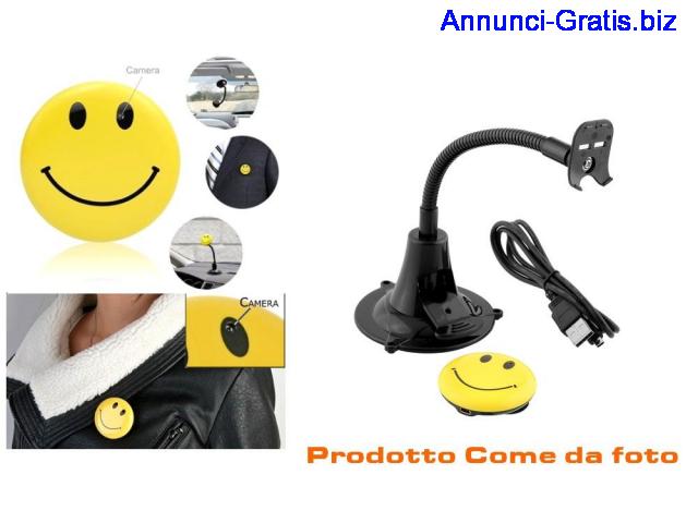 Telecamera occulta in un mini smile spia con supporto da auto. Risoluzione fenomenale in 720x480. Utilissimo per uso in auto, come registrazione dei percorsi o per scovare chi riga l'auto in vostra assenza e consegnare le prove ai carabinieri (sul video è impressa data ed ora). Può essere usato anche per la registrazione in ambienti aperti o tramite il supporto posteriore applicato alla giacca.